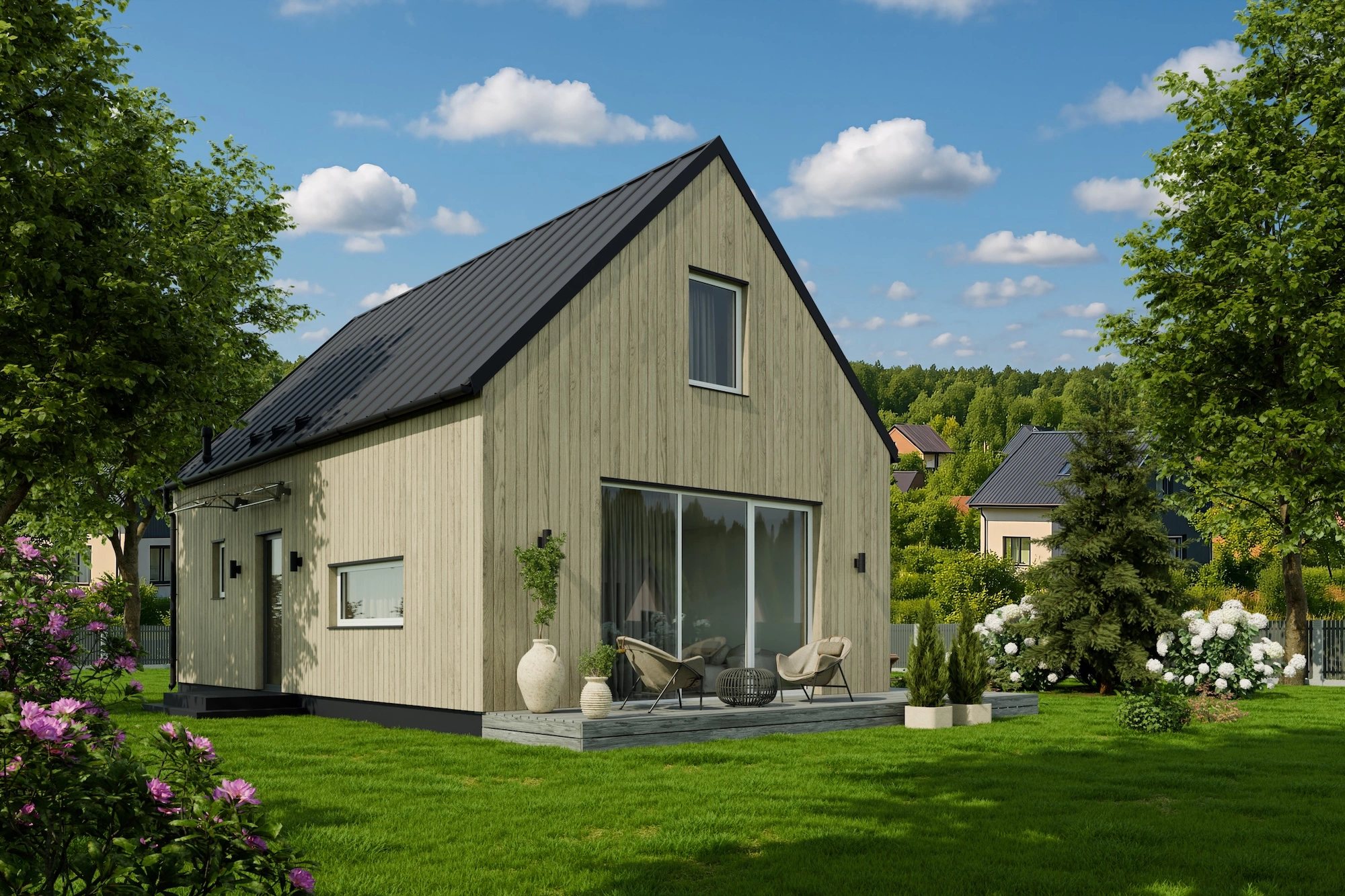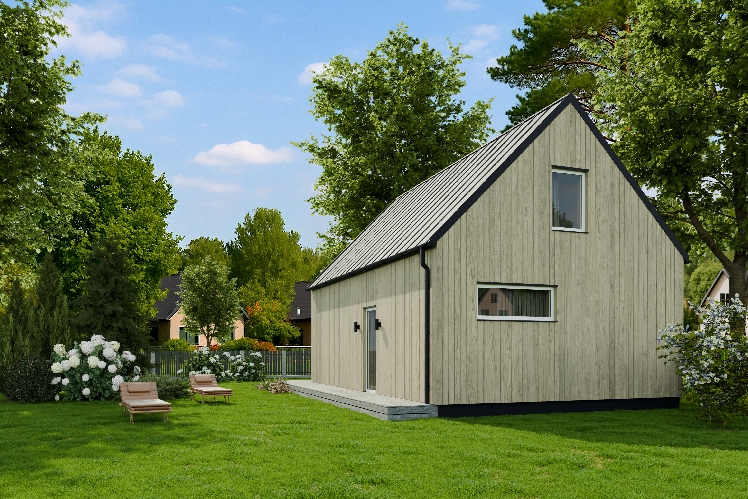 Ēkas vizuālo tēlu papildina klasisks divslīpju jumts mūsdienīgā, energoefektīvā izpildījumā, kas piešķir arhitektūrai izteiktu, bet mierīgu akcentu.