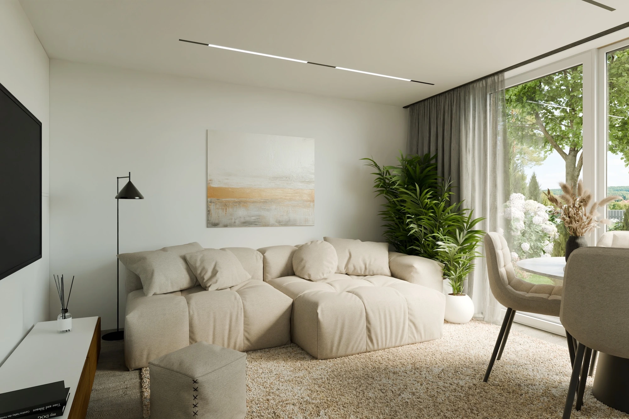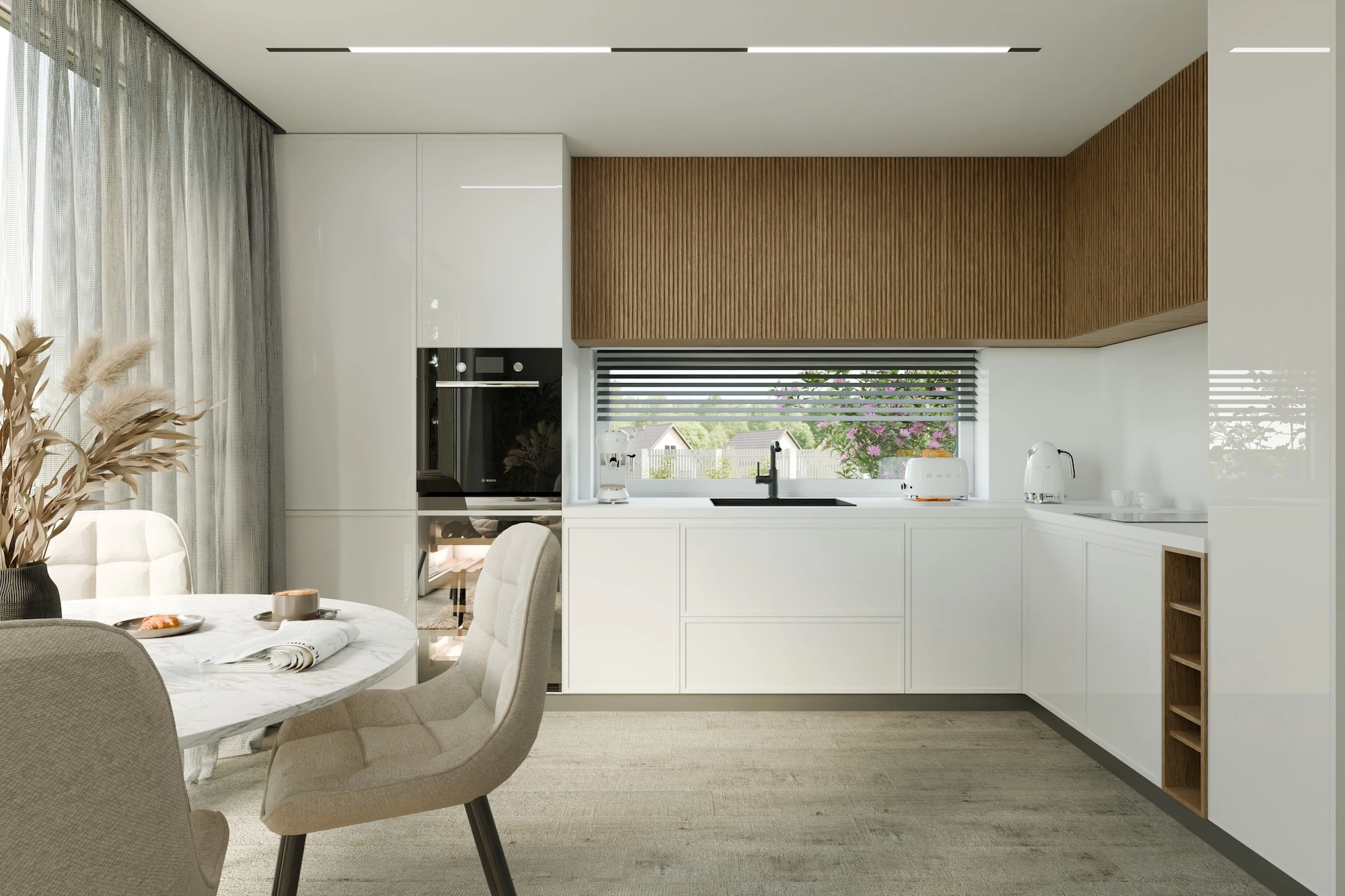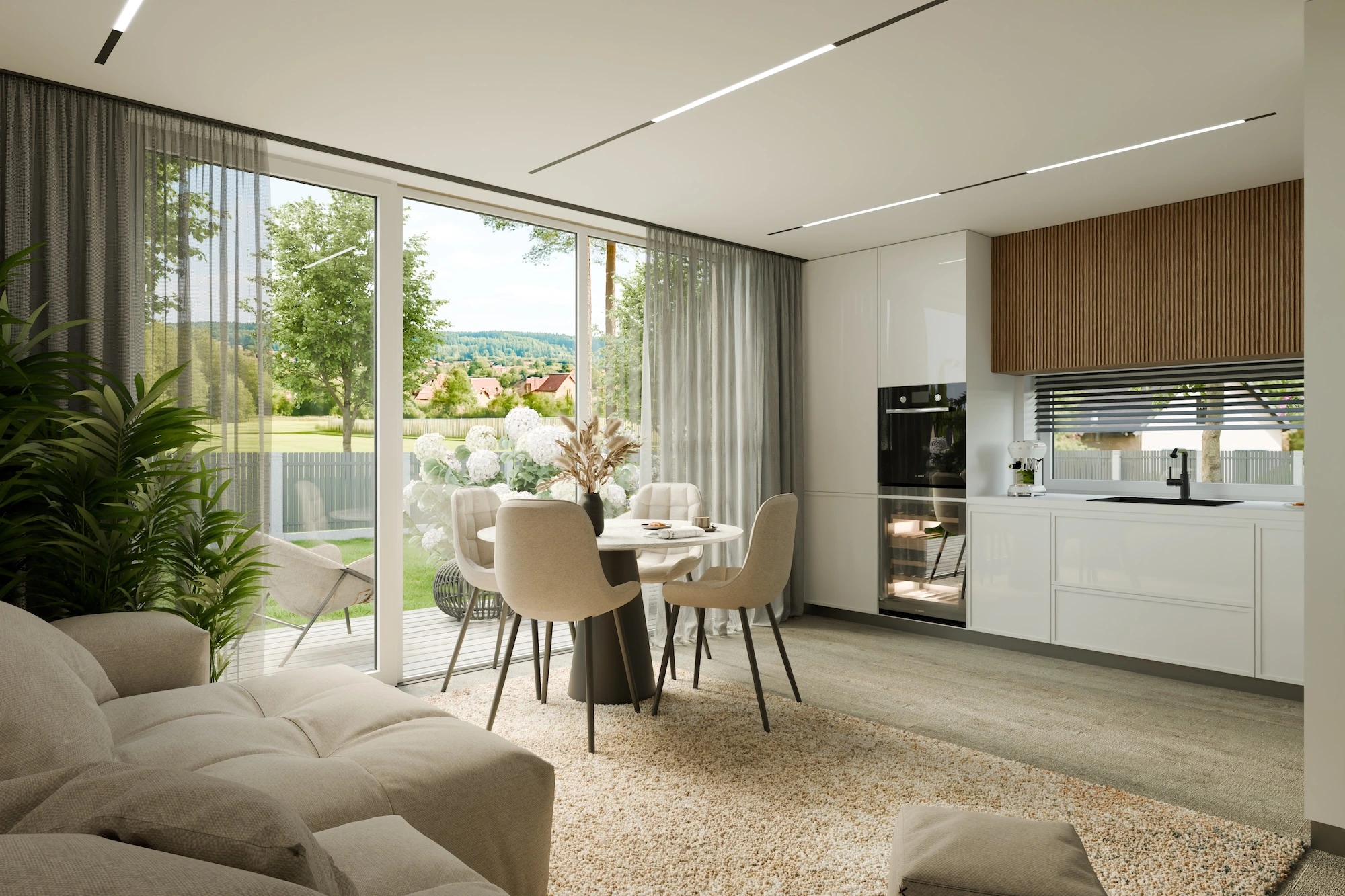 Lielās stikla durvis veido izteiktu saikni ar dabu, dabiski sapludinot iekštelpu ar dārzu un padarot potenciālo terasi par dzīvojamās zonas turpinājumu.